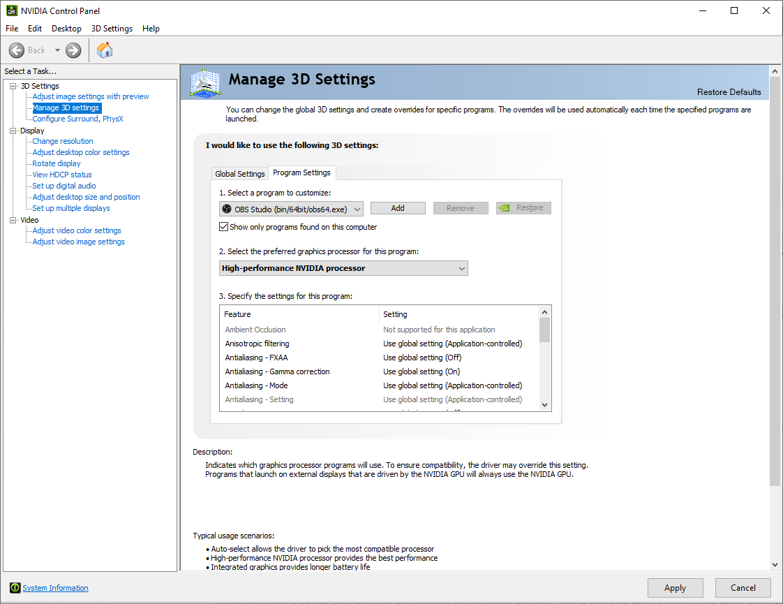 If you want to use game capture to capture a game or use the NVENC encoder, select "High Performance NVIDIA Processor".