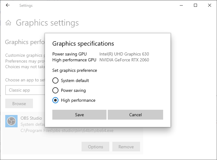 Open Settings and search for "Graphics Settings". Select "Classic App" and browse to C:\Program Files\obs-studio\bin\64bit\obs64.exe (or wherever you have installed OBS). Click "Options" (example screenshot).